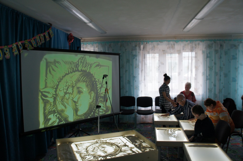 Занятия по рисованию песком мы обязательно включим в план работы дома-интерната и, может быть, однажды вместе с нашими бабушками и дедушками порадуем горожан шоу под названием «Укрощённый песок времени».