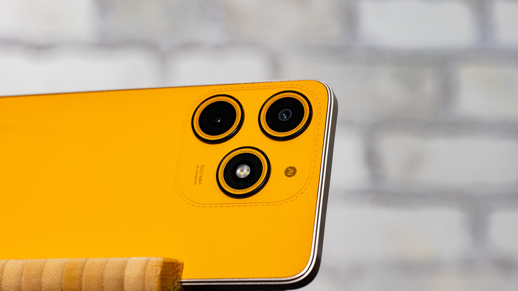 Как я уже сказал, у меня на тестировании лимитированная версия Tecno SPARK 10 Magic Skin с задней панелью, обтянутой оранжевой экокожей. Смартфон смотрится свежо и обладает узнаваемой издалека внешностью. При внимательном изучении сразу обращаешь внимание на детали в отделке — вокруг блока камер есть имитация строчки, которая при беглом взгляде выглядит как настоящая и придает дизайну дополнительный стиль. Но и это еще не все — рамки вокруг камер такого же оранжевого цвета, и все это выглядит как большой высокотехнологичный сочный апельсин у вас в руках. Лично мне очень нравятся такие смелые и яркие решения, потому что большинство смартфонов могут предложить лишь еще один тысячный оттенок черного, серого или белого. А здесь — праздник каждый день!