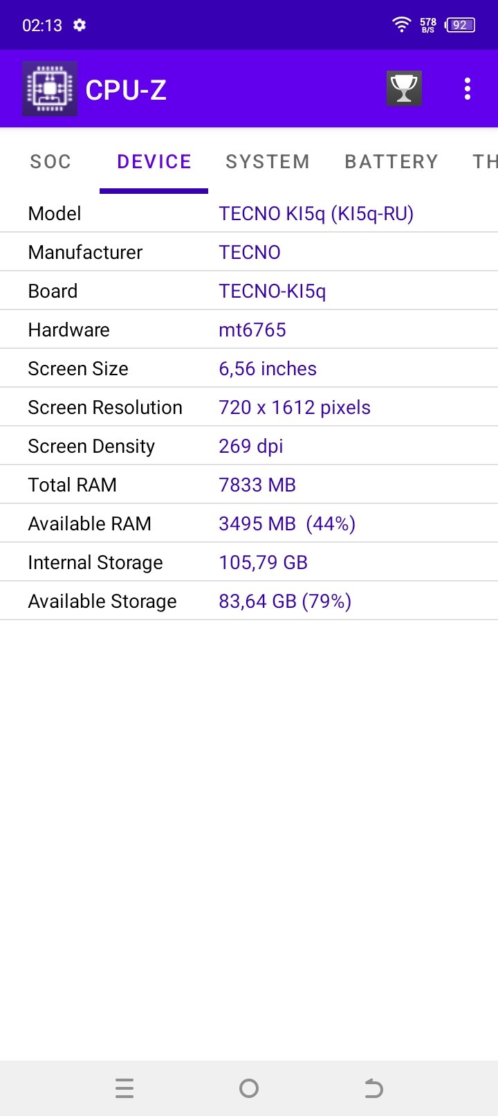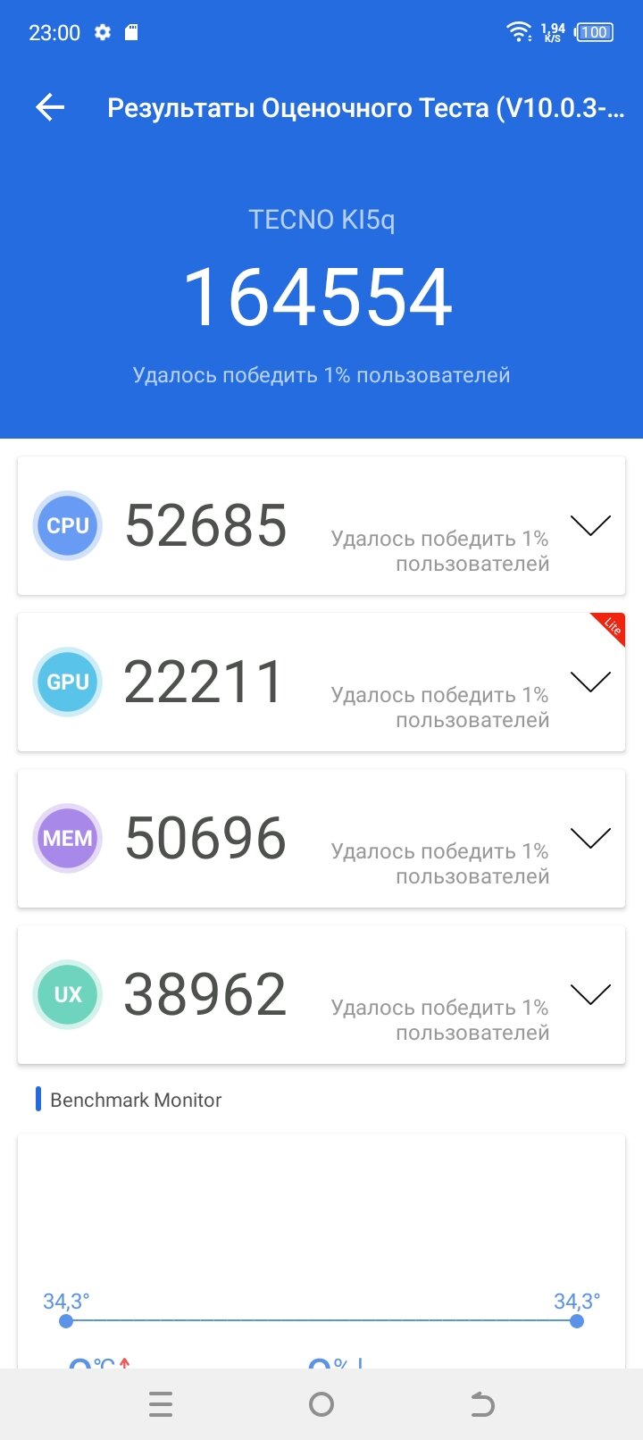 Смартфон Tecno SPARK 10 Magic Skin построен на базе MediaTek Helio G37 с восемью ядрами, работающими по схеме big.LITTLE, — четыре ядра Cortex-A53 с частотой 2,3 ГГц и четыре ядра Cortex-A53 с частотой 1,8 ГГц. Версия Pro использует более мощный процессор Helio G88, но разница не особо велика. Видеомодулем здесь выступает PowerVR GE8320, это тоже не такой мощный GPU, как в старшей версии. Я запустил бенчмарки, и результаты действительно снизились, но потом я установил игры и программы и осознал, что они работают точно так же, как и на старшей версии. Да, производительность процессора ниже, но и разрешение меньше, поэтому, если вы хотите играть в новейший Call Of Duty Mobile — у вас будет такая возможность, только игра не даст выставить высокие настройки. Все программы и игры работают без лагов и тормозов — придраться ни к чему не могу. При максимальной нагрузке в виде получасового забега в Call Of Duty Mobile, согласно данным с пирометра Sinometer BM300, температура самой горячей точки смартфона составляла 40,1 градуса, то есть ни о каких перегревах и речи быть не может.