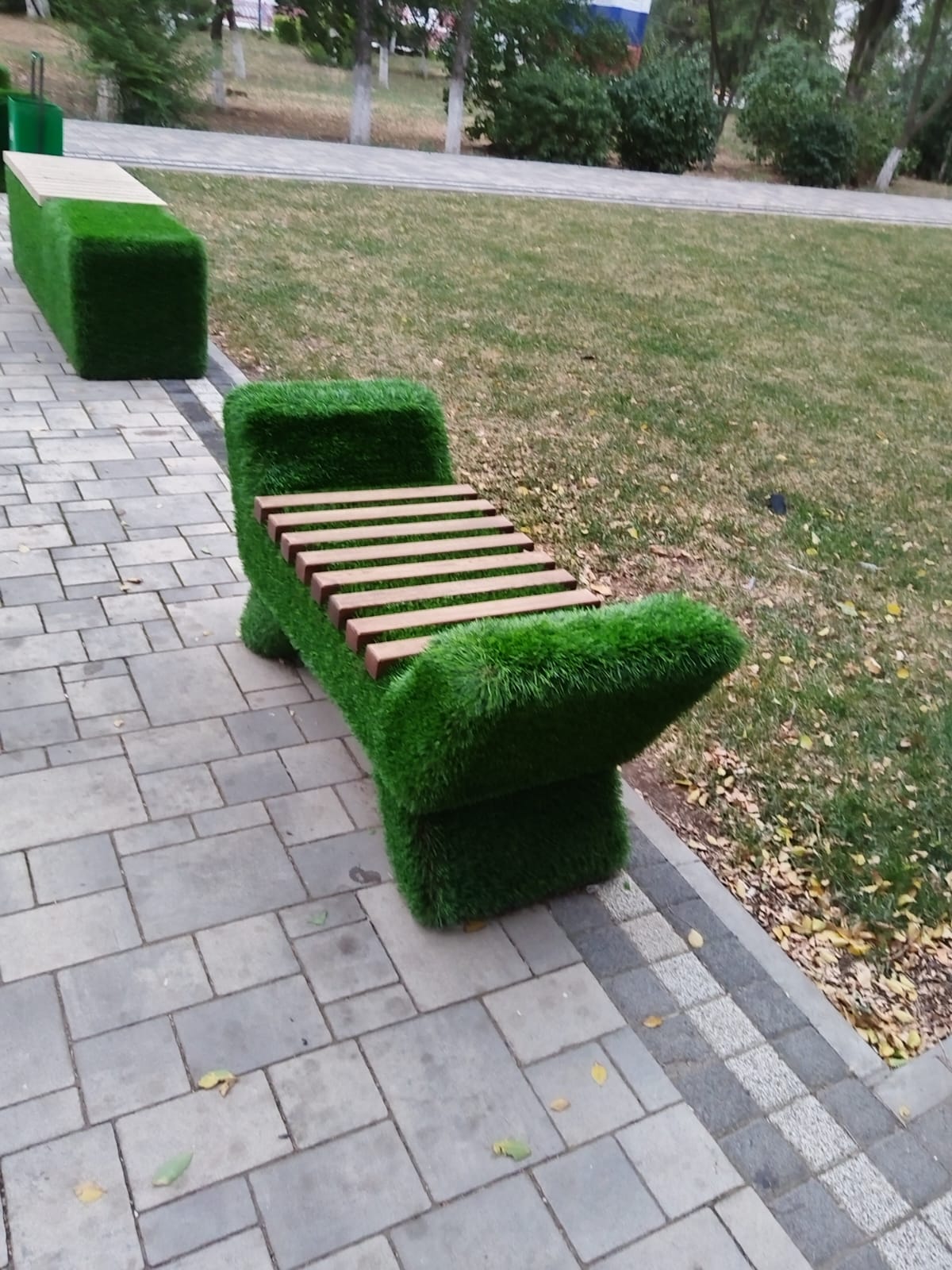 Вот увидели скамейки со знакомым зеленым синтетическим покрытием. Подумали, неужели у сайгаков сняли, что на Пагоде «паслись». Нет. Оказывается, сайгаки сохранили и «шкуру» и даже приобрели нового товарища – кажется, лошадь. Все они «пасутся» теперь напротив детской игровой площадки и лотков со сладостями и сувенирами.