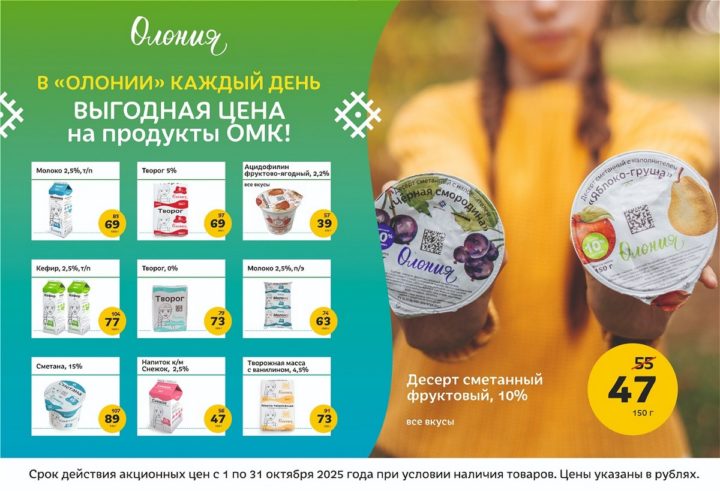 С 1 по 31 октября 2025 года во всех магазинах «Олонии» можно купить самую востребованную продукцию Олонецкого молочного комбината по выгодной цене! Например, молоко в мягкой упаковке — за 63 рубля, творог 5% за 69 рублей, а сметанные десерты – всего за 47 рублей!