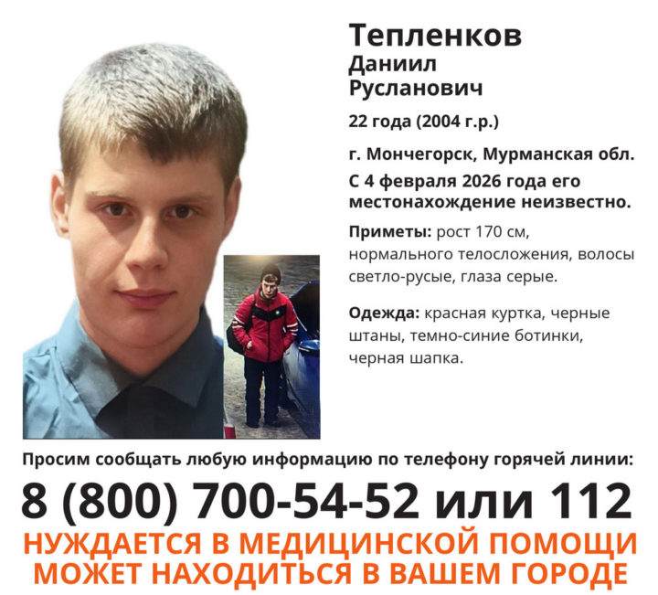 22-летний Даниил Русланович Тепленков пропал 4 февраля в городе Мончегорске Мурманской области. Волонтеры регионального поискового отряда «ЛизаАлерт» просят помощи в поиске.