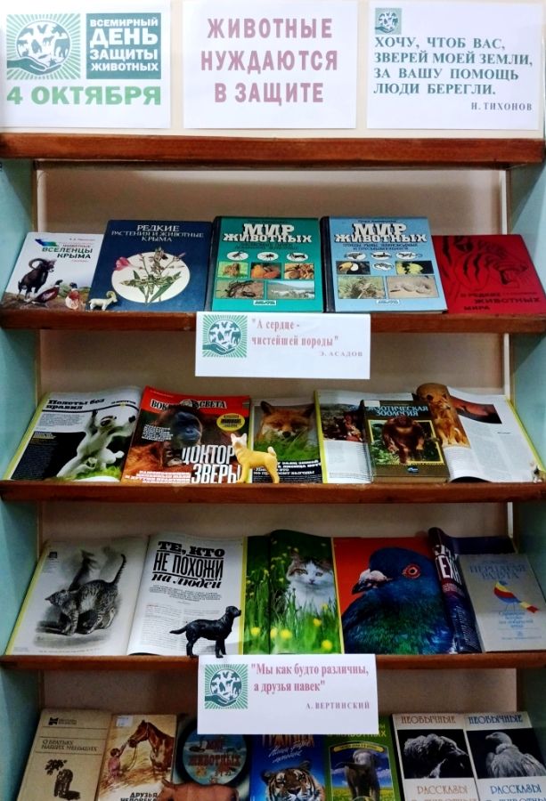 В преддверии международной даты симферопольская библиотека-филиал №4 им. М.М.Коцюбинского организовала литературно-экологическую выставку «Животные нуждаются в защите».
