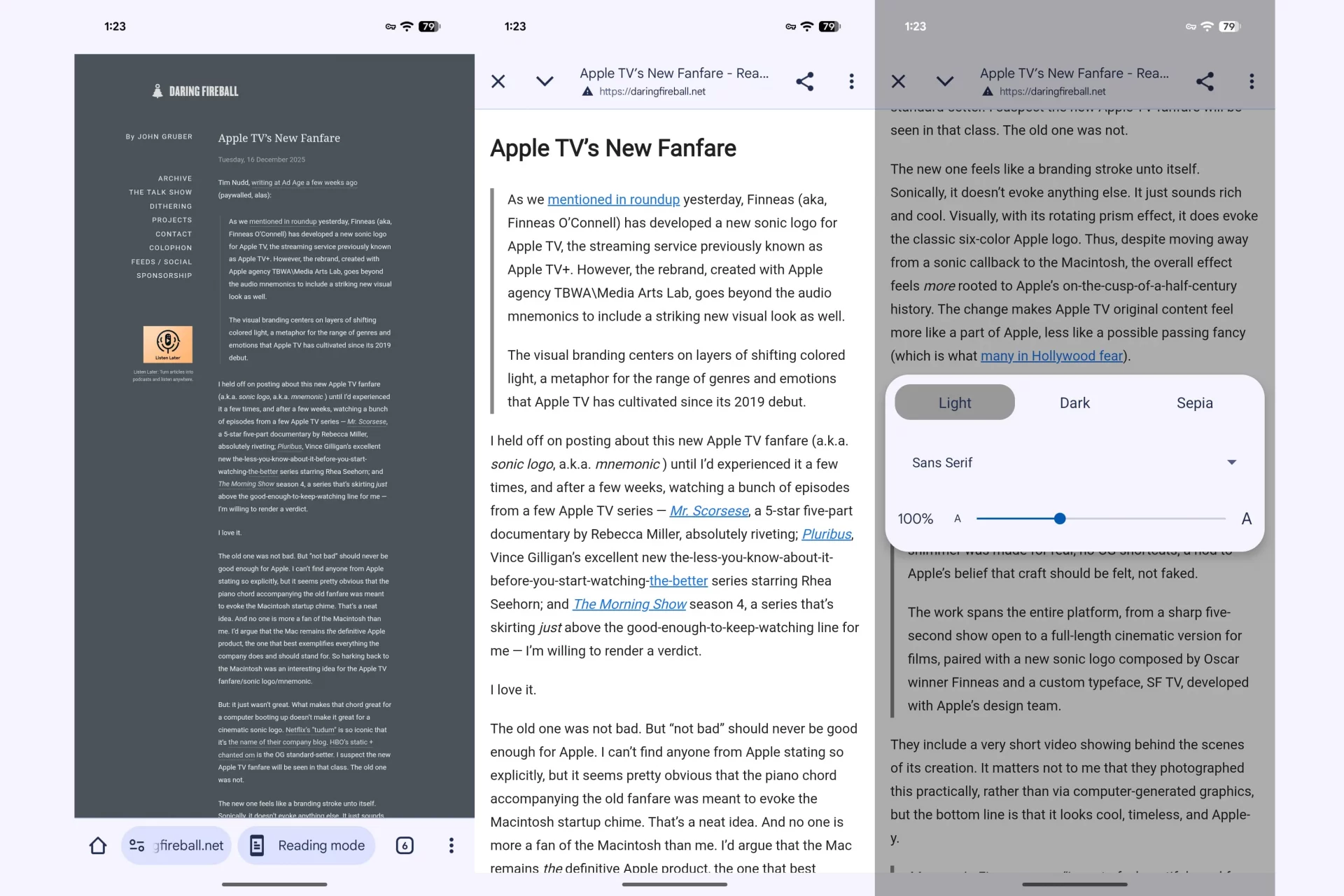 Лично я считаю, что это долгожданное изменение, которое делает бесполезную функцию действительно полезной. Раньше я игнорировала старый режим чтения, потому что полноэкранный режим немного раздражал, как будто я случайно открыла другое приложение. Кроме того, старая кнопка работала нестабильно: иногда она была на месте, а иногда нет. Добавление кнопки в меню требует одного дополнительного нажатия, но знать, что она всегда там, где нужно, стоит того.