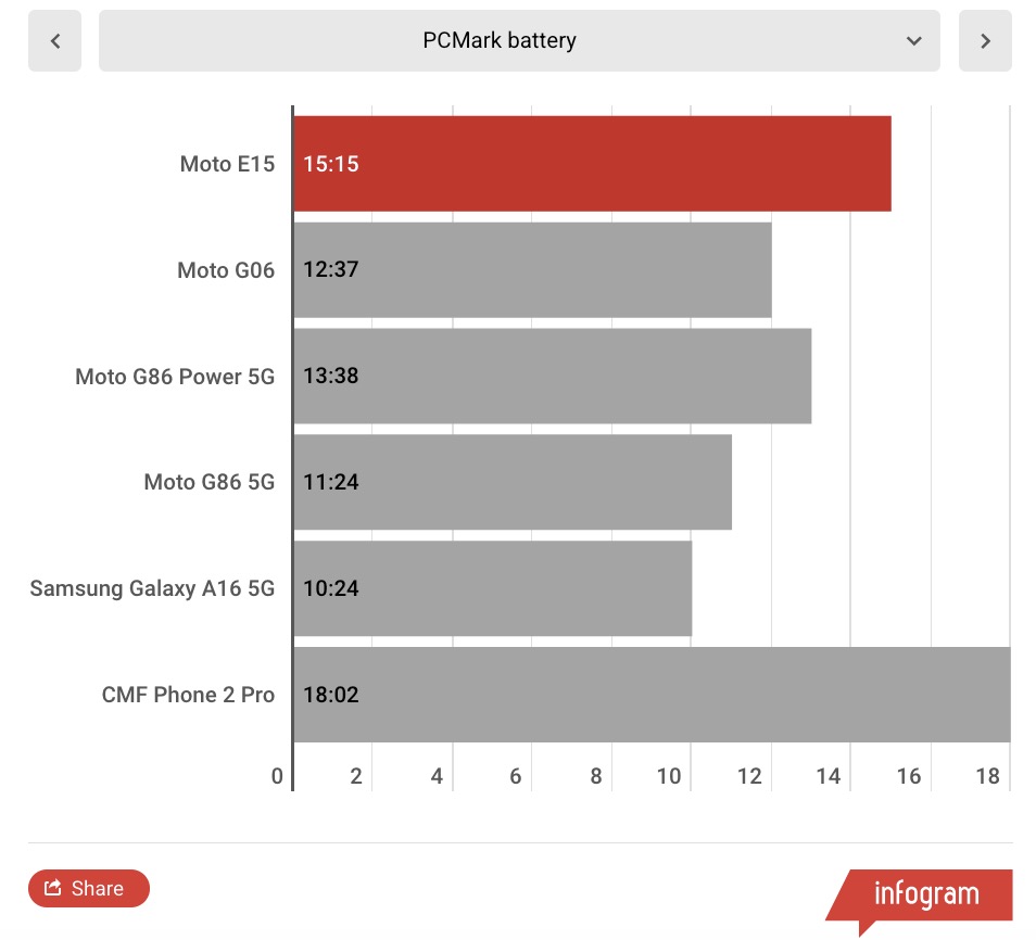 В тесте батареи PCMark смартфон Moto E15 проработал 15 часов и 15 минут, что впечатляет для телефона такой низкой стоимости.