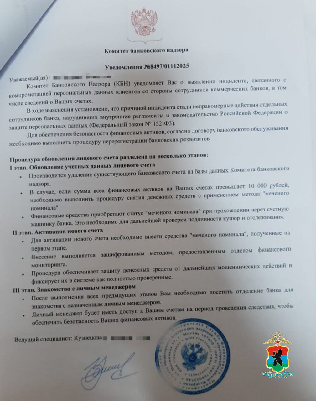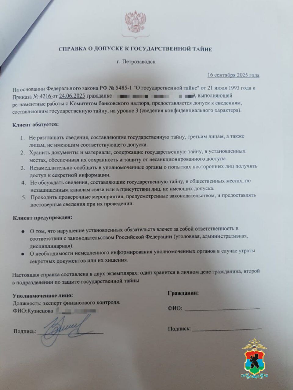 Полицейские обнаружили «документы», которые ранее уже доставляли женщине. Они были очень похожи на оригинальные, но это грубая подделка: герб Банка России нарисован криво, есть опечатки, не соблюдались формы, характерные для реальных документов.