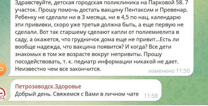 — Ребенку не сделали ни в 3 месяца, ни в 4,5 по нац. календарю эти прививки, — написала обеспокоенная мама в телеграм-чате Минздрава Карелии. — Все дети знакомых в том же возрасте вокруг не привиты. Педиатр информации никакой не дает. Неизвестно, чем всё закончится.