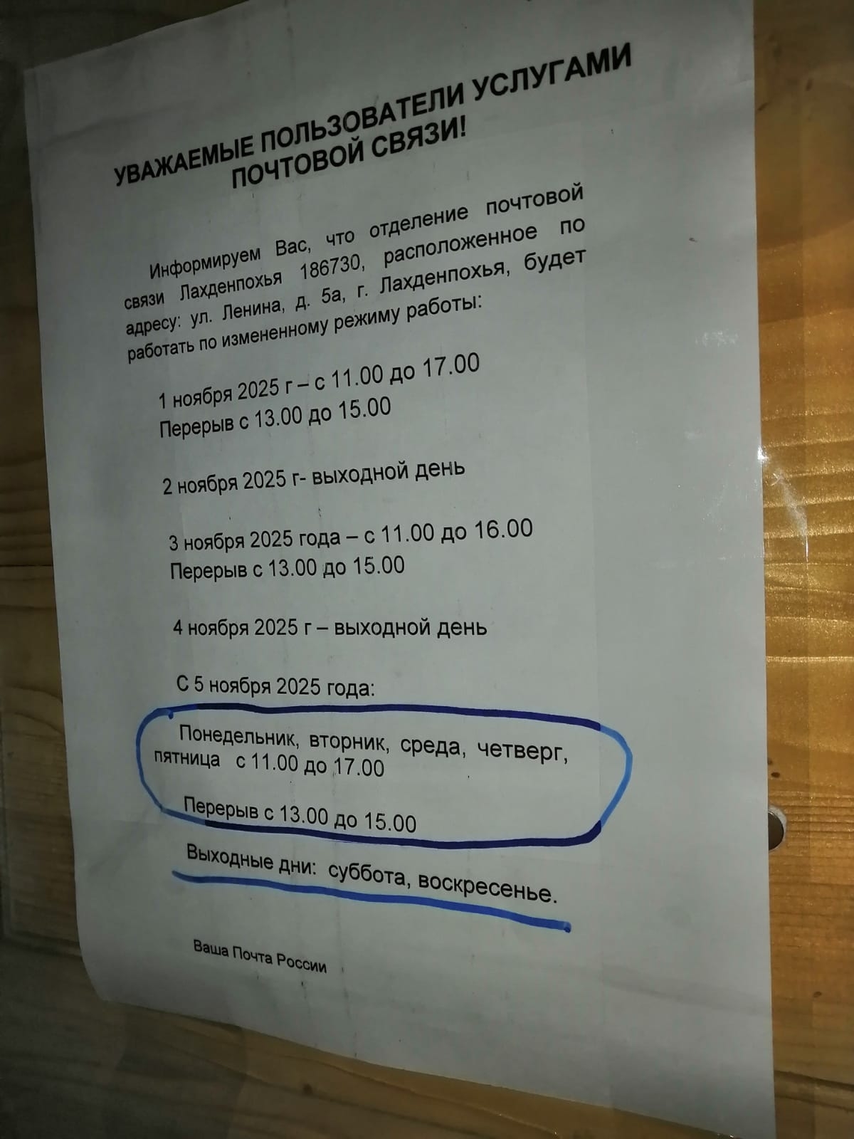 Отделение открывается только в 11:00, но люди занимают очередь задолго до этого. В 10:55 возле двери отделения уже стоят 18 человек. В отделении работает всего один сотрудник, который должен и пенсии выдавать, и посылки отпускать, и необходимые справки оформлять. Получить посылку нереально, пишет горожанин в паблике «ЛахденпохьЯ — НАВСЕГДА!».