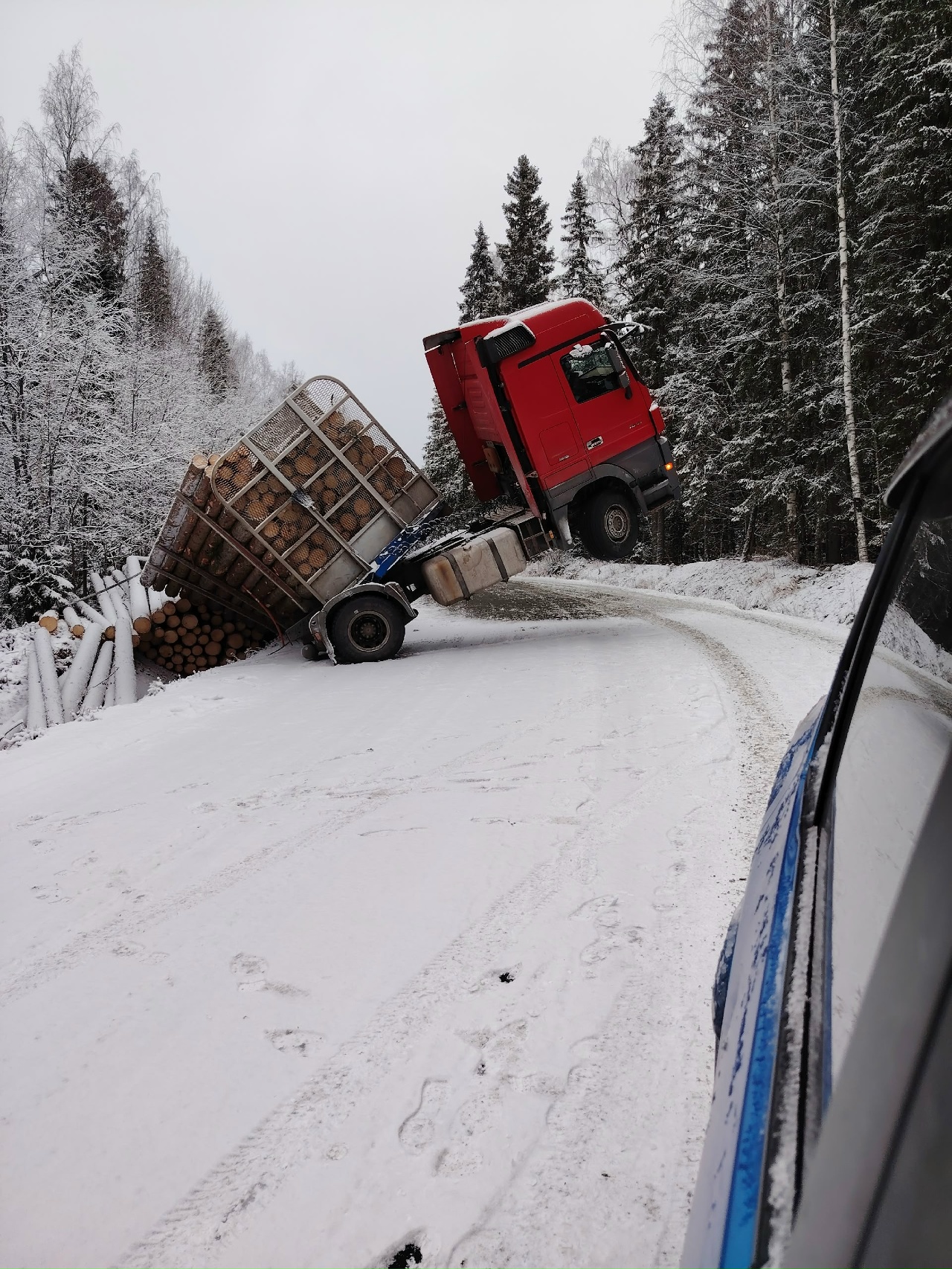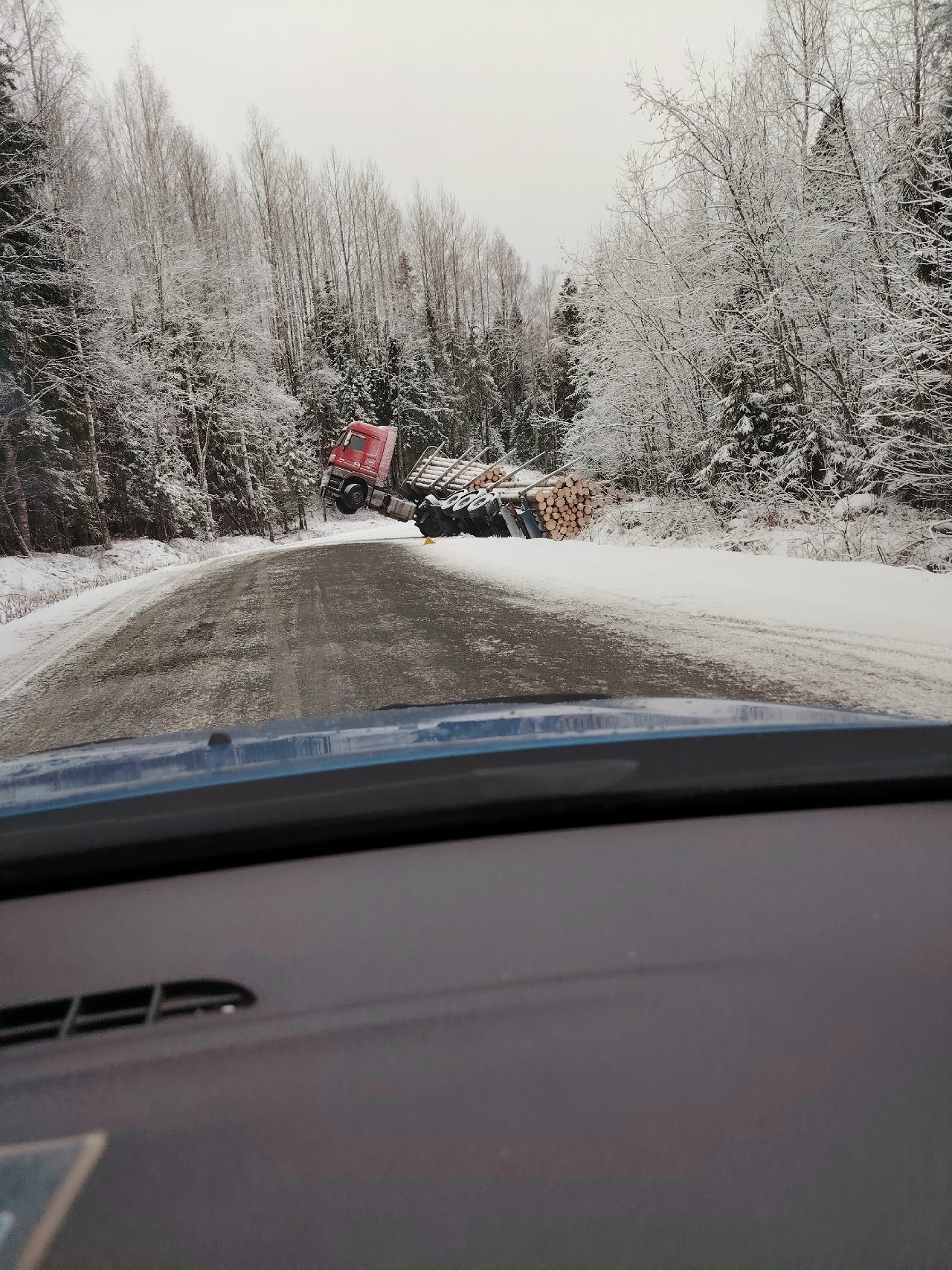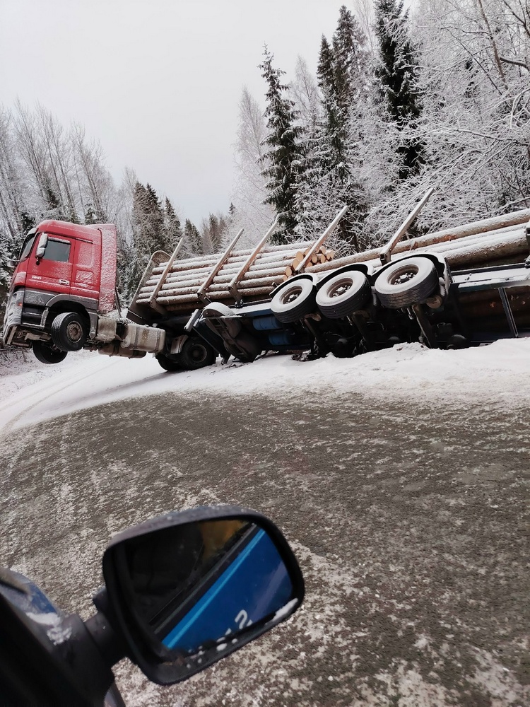 Вчера. 19 ноября, на трассе Ведлозеро — Видлица опрокинулся в кювет груженый лесовоз.