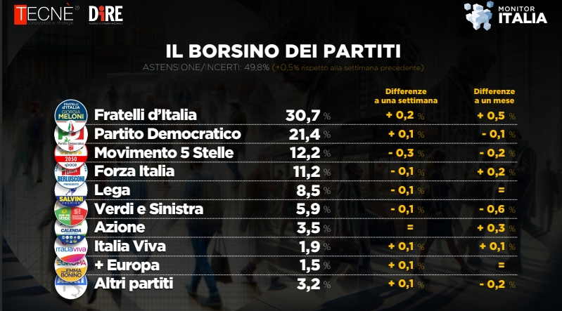 Non si ferma la crescita del centrodestra secondo gli ultimi sondaggi elettorali di Tecné, che mostrano, in particolare, una avanzata di Fratelli d’Italia che arriva al 30,7% salendo di due decimali rispetto a una settimana fa e di mezzo punto rispetto al mese scorso. Se poi la Lega è stabile, all’8,5%, Forza Italia è aumentata dello 0,2% all’11,2%.