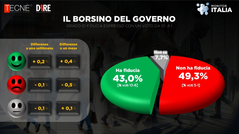 Coerenti con questi dati sono quelli sulla fiducia degli italiani nel governo, che secondo gli ultimi sondaggi elettorali di Tecné è un crescita, ha raggiunto il 43%, lo 0,4% in più rispetto a settembre, mentre sono scese di mezzo punto, al 49,3%, le opinioni negative.