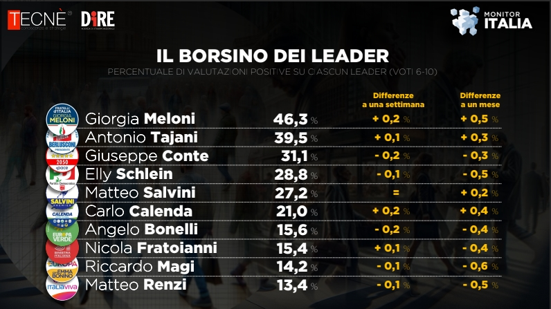 Ancora più eloquenti sono i numeri sul gradimento dei leader. Aumenta quello per quelli di centrodestra, con Giorgia Meloni che arriva al 46,3%, mezzo punto in più rispetto a un mese fa, e Antonio Tajani al 39,5%, lo 0,3% in più rispetto a un mese fa. Su anche Matteo Salvini, che in un mese cresce di due decimali al 27,2%.