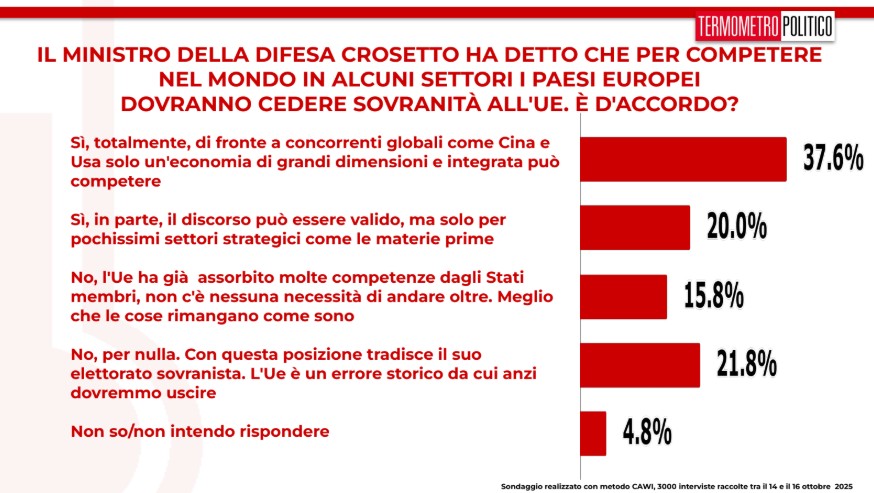 Il ministro della Difesa Crosetto ha detto che per competere nel mondo in alcuni settori i Paesi europei dovranno cedere sovranità all’UE. Abbiamo chiesto ai nostri lettori se si trovano d’accordo.