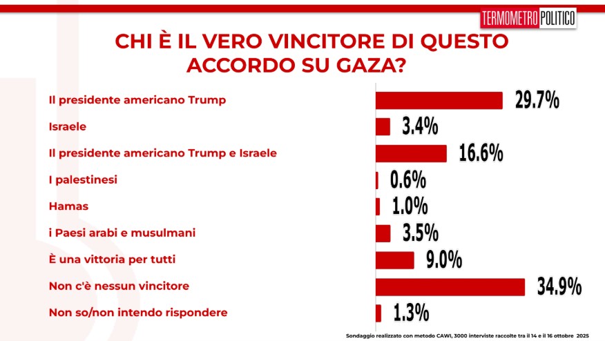 Dopo il conto di circa 70.000 morti e un massacro/genocidio (a seconda delle credenze personali), la risposta più frequente su chi sia il vero vincitore dall’accordo su Gaza è che “non c’è nessun vincitore”: la pensa così il 34,9% degli italiani. C’è, però, un volto che spicca sopra tutti, ed è quello del presidente Trump, per molti (29,7%) vero autore dell’accordo. A questi, si aggiunge un altro 16,6% che considera l’accordo su Gaza come una vittoria per lo stesso Trump ma anche per Israele. L’ultima risposta con una certa rilevanza è quella che afferma che è una vittoria per tutti, opzione scelta dal 9% del campione. Le altre sono residuali e si segnala come praticamente nessuno veda l’accordo come una vittoria di Hamas (1%) o dei palestinesi (0,6%).