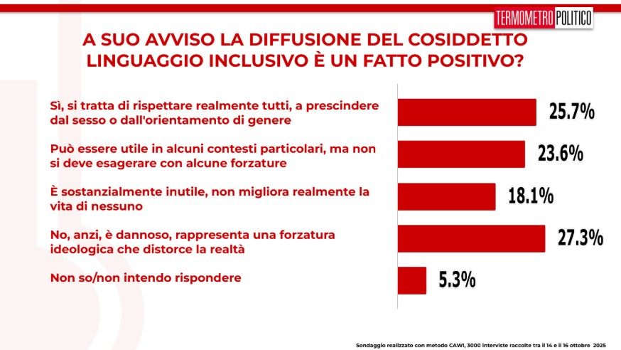Nel complesso, c’è una leggera maggioranza di favorevoli al linguaggio inclusivo (49,3% vs 45,4%), anche se il sostegno è legato alla diffusione solo in alcuni contesti, evitando forzature.