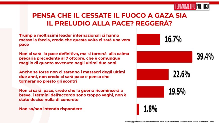 Dopo la tregua, sarà pace? Per un conflitto che va avanti da oltre settant’anni, c’è solo una minoranza che si dichiara fiduciosa: per il 16,7% “Trump e moltissimi leader internazionali ci hanno messo la faccia, credo che questa volta ci sarà una vera pace”.