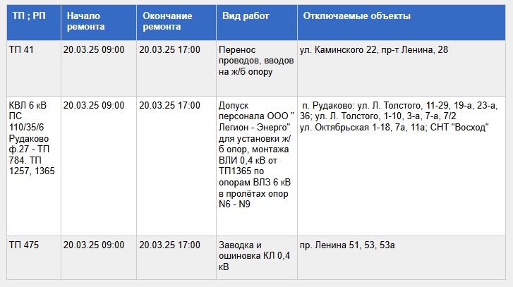 Полный список адресов и график отключений представлены ниже: